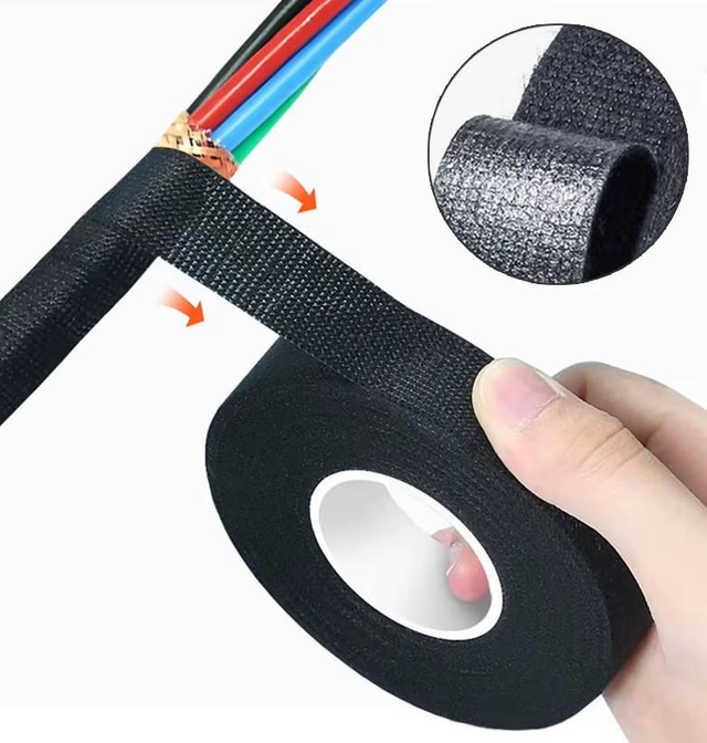 Rouleau de 15 mètre de ruban adhésif en tissu noir pour l'isolation des cables électriques automobile.